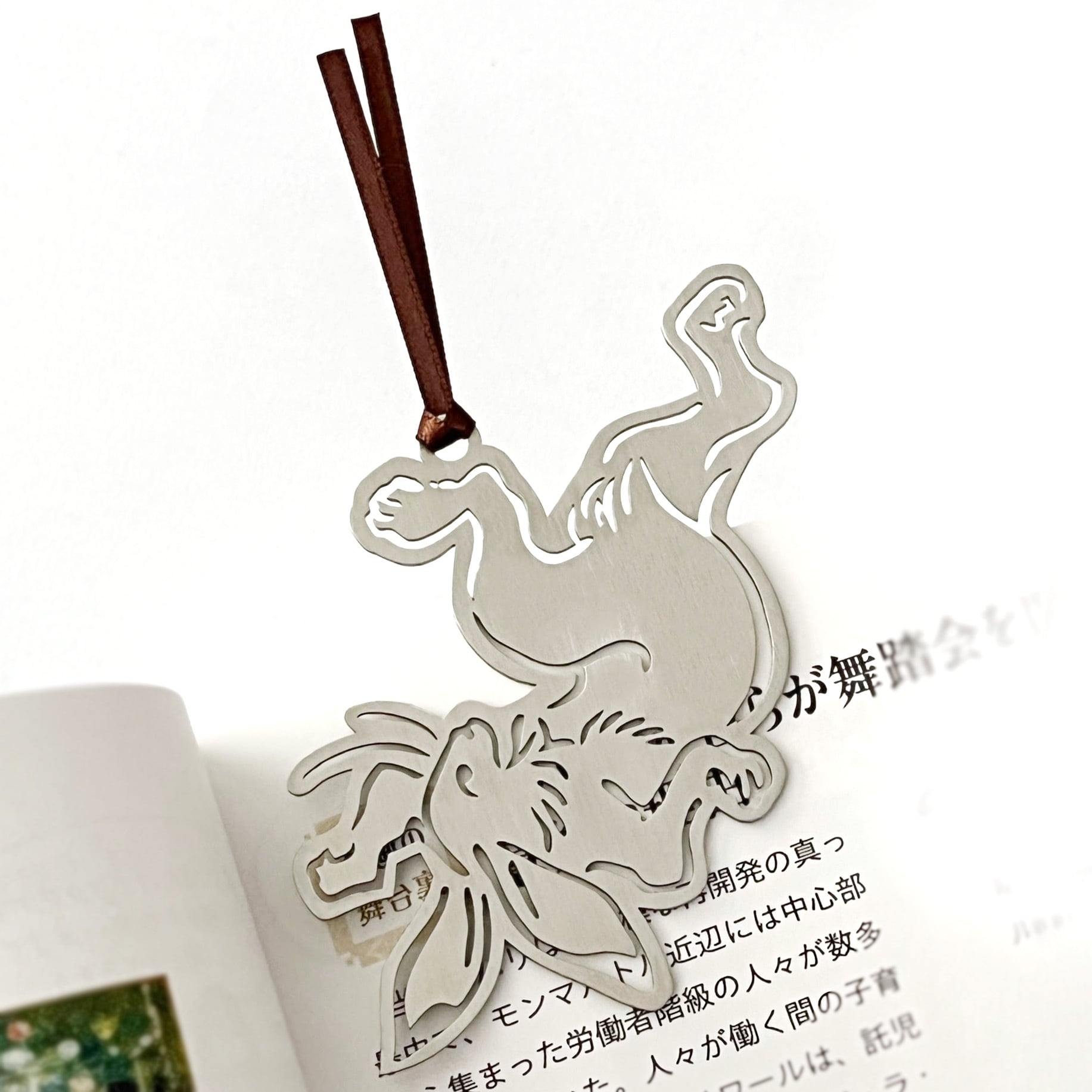 ページの間から覗く兎のシルエットと、金属ならではの確かな重みが、読書の時間を静かに引き締めます。