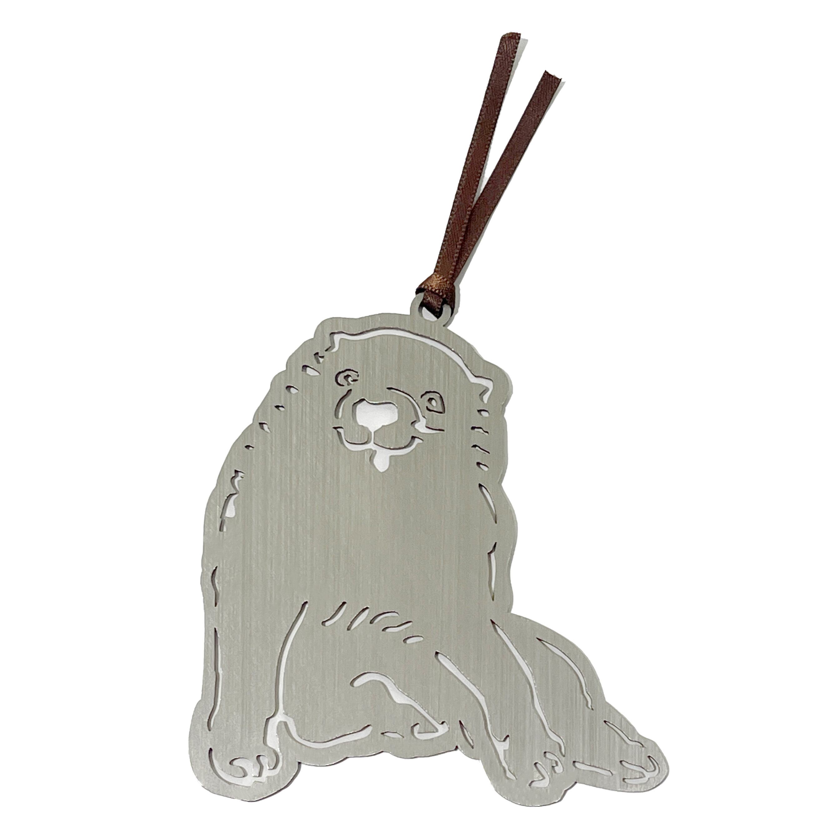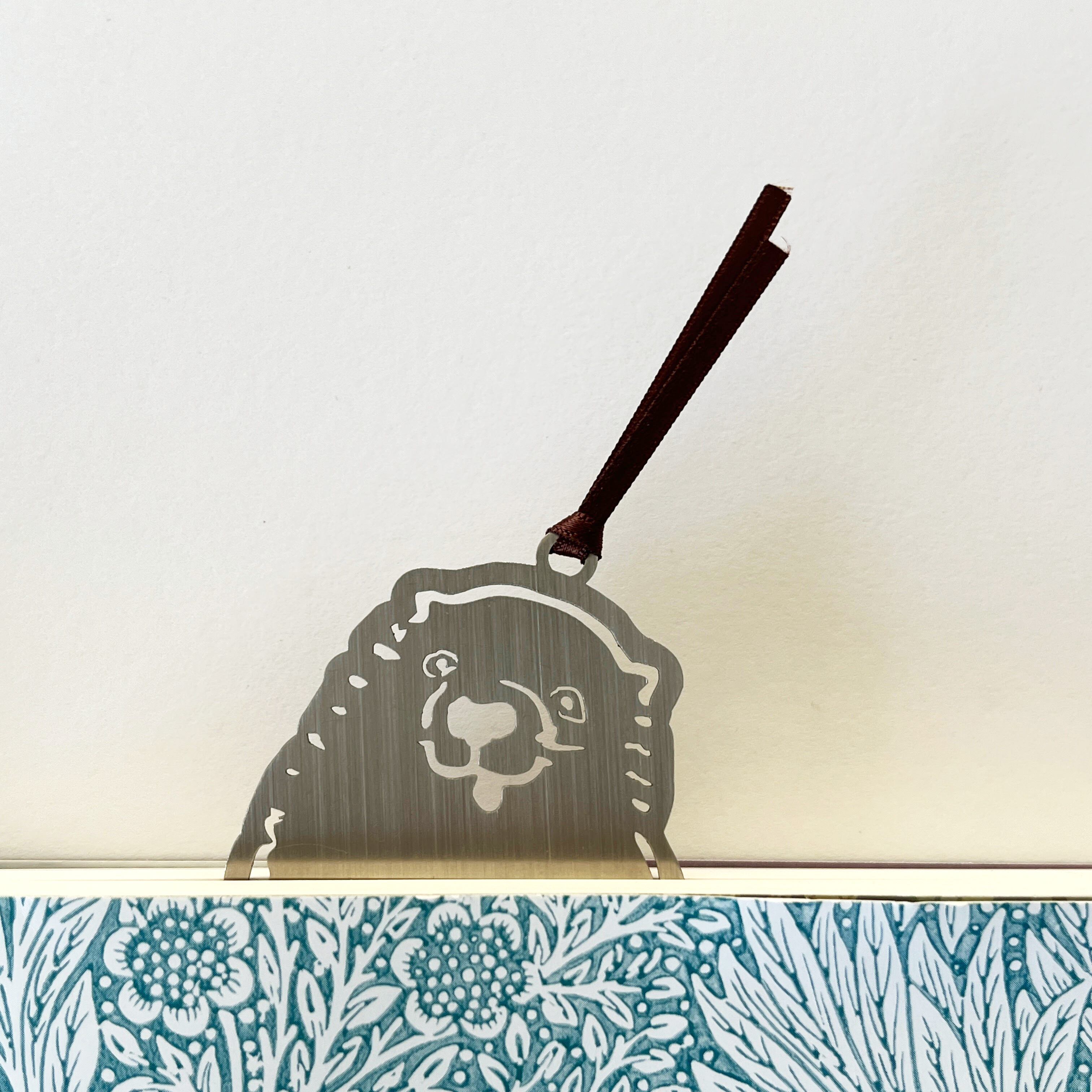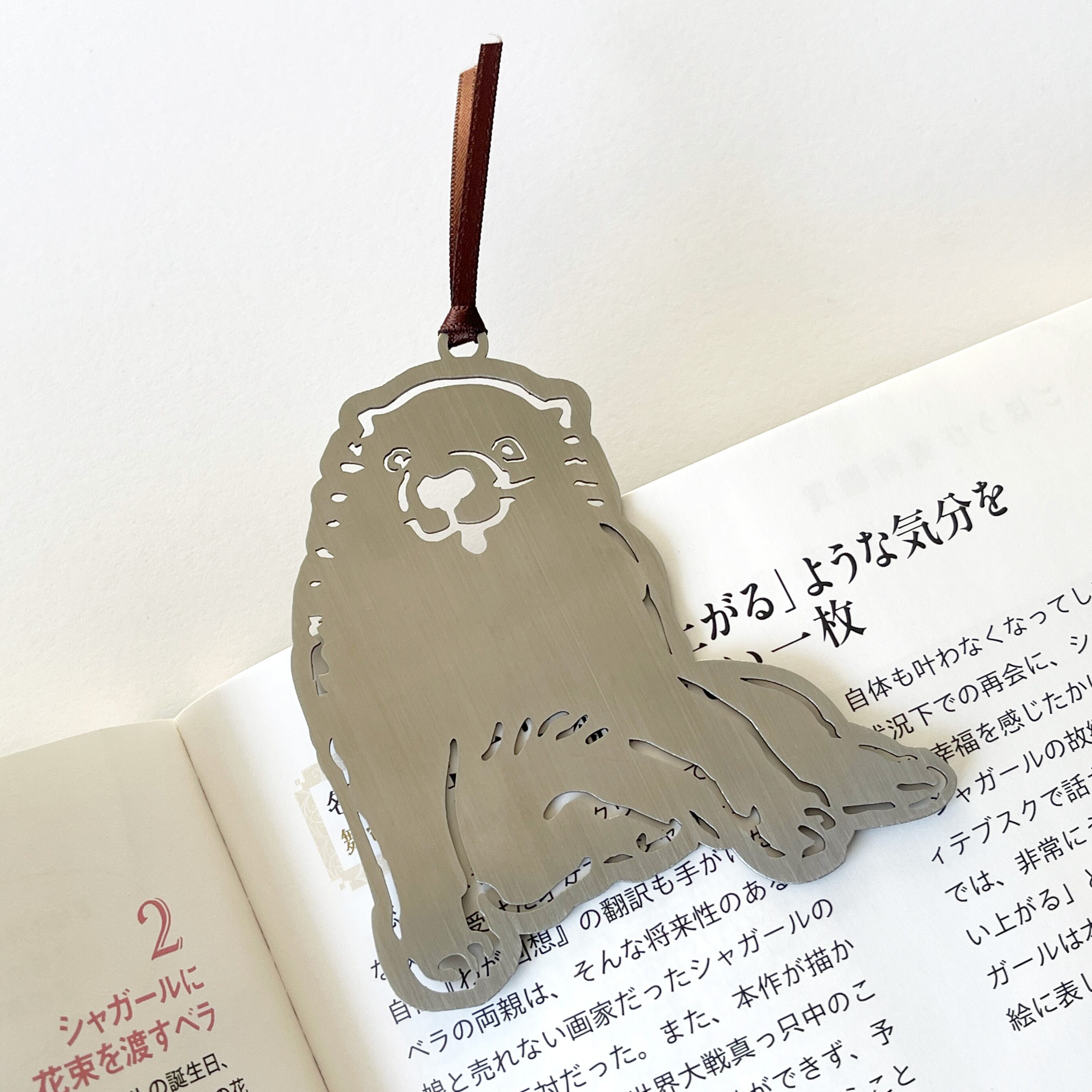 ページの間から覗く仔犬のシルエットと、金属ならではの確かな重みが、読書の時間を静かに引き締めます。