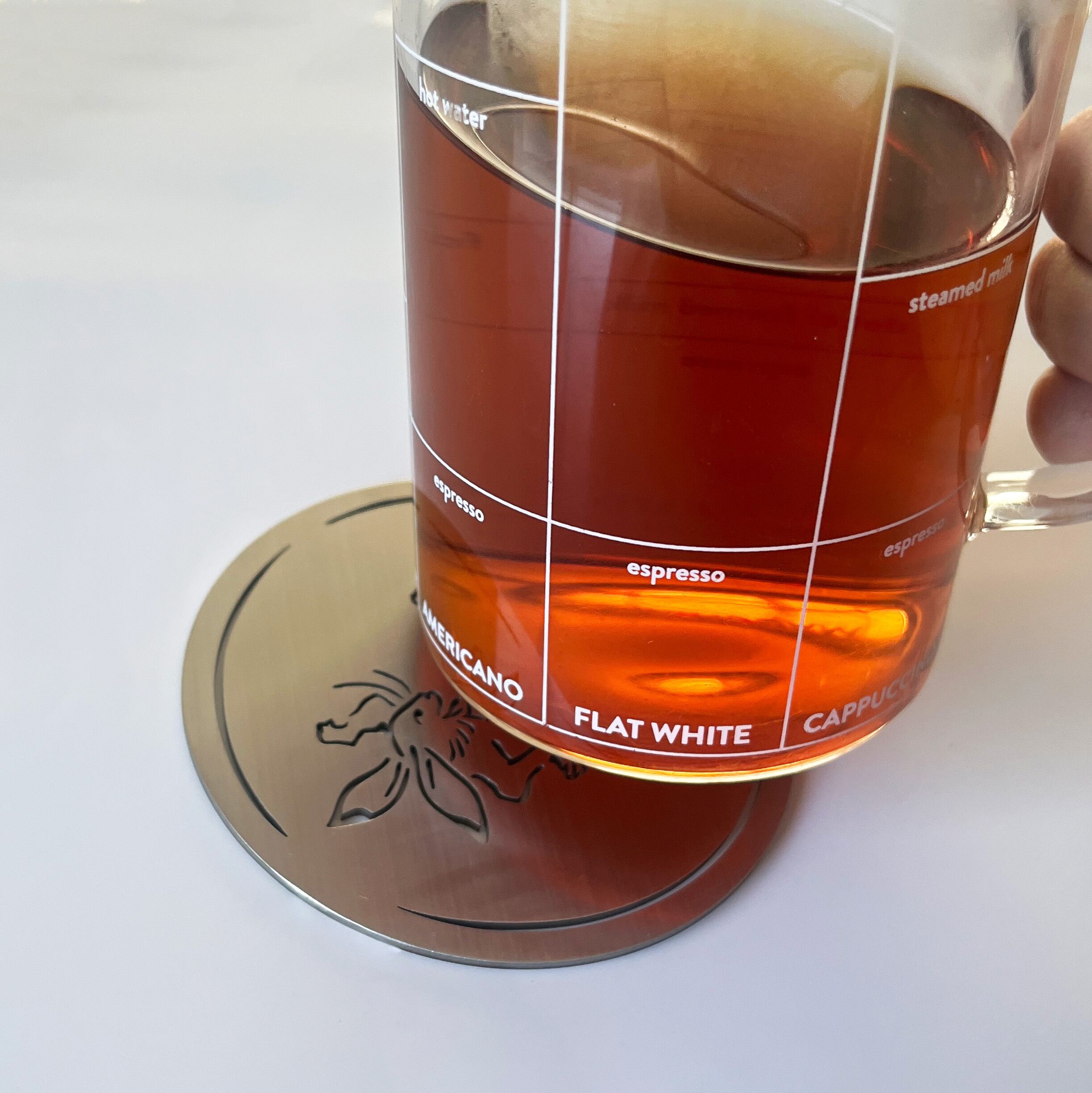 飲み物の下に敷くだけで、金属ならではのしっかりとした重みと落ち着きある存在感を添えます。